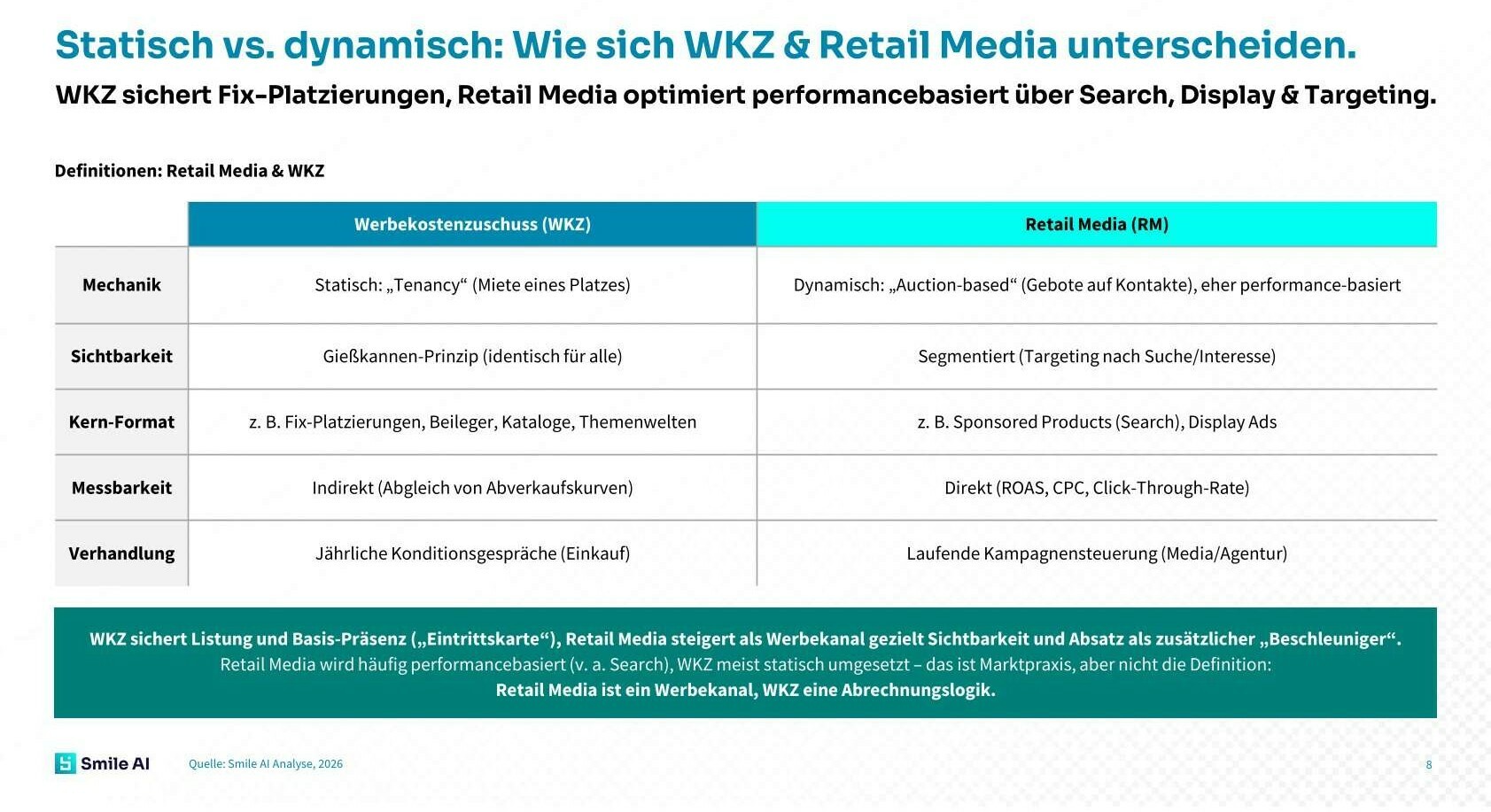 Ergänzend zeigt die Abgrenzung zwischen WKZ und Retail Media, warum Erfolgsmessung im Trade Marketing heute differenzierter gedacht werden muss: Während WKZ meist auf statischen Fix-Platzierungen und klassischen Konditionslogiken basiert, funktioniert Retail Media deutlich dynamischer, zielgruppenbezogener und performanceorientierter. Für Hersteller bedeutet das, dass nicht jede Maßnahme mit denselben KPIs bewertet werden kann. WKZ sichert vor allem Basis-Präsenz und Listungsnähe, Retail Media wirkt dagegen als zusätzlicher Hebel für Sichtbarkeit, Traffic und Abverkauf. Genau deshalb braucht modernes WKZ-Controlling eine Datenbasis, die beide Logiken zusammenführt und sowohl Präsenz- als auch Performance-Effekte messbar macht. Die folgende Abbildung zeigt einen Auszug aus der Smile AI Analyse: